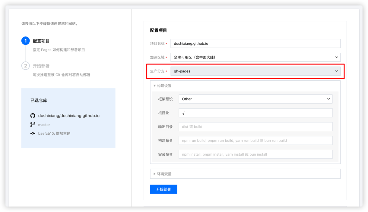 然后,你要在 EdgeOne 上创建一个 Pages 项目,选择你的 Github Pages 仓库,记得分支选择编译后文件所在的 gh-pages 然后选择 Other 预设,其他不需要改变。